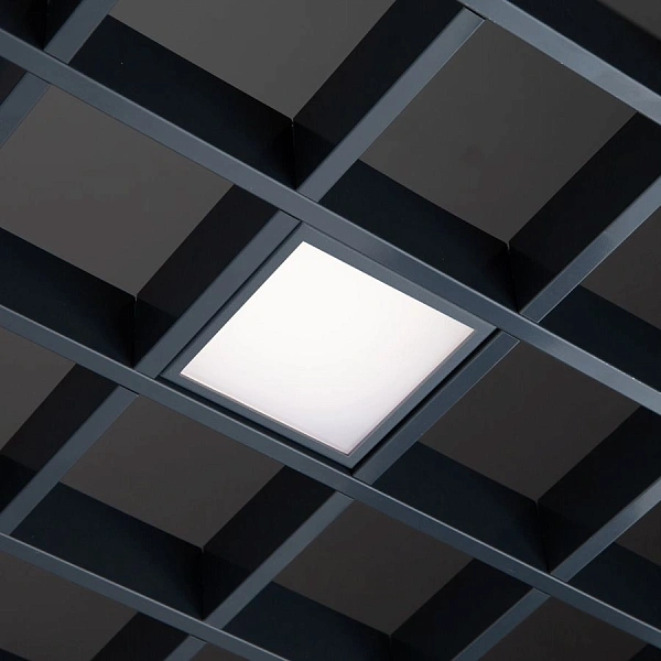 Габарити світильника 600×600 мм точно збігаються з коміркою підвісної стелі типу Армстронг (595×595). Це дає змогу: